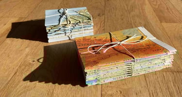 Each Golem Book is unique and made from at least 75% reused materials. We use only non-adhesive binding techniques: instead of glue, we rely on sewing, cutting, and folding to hold the books together.